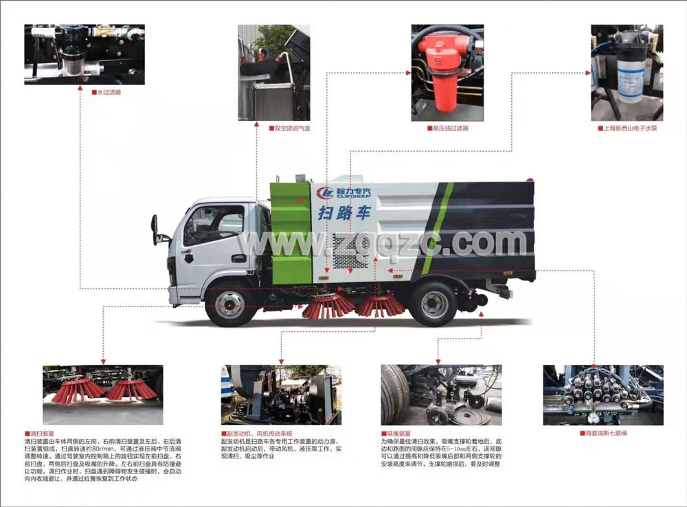 上裝標配:帶4個掃盤、江鈴78馬力副發(fā)動機、三洋馬達、施耐德控制開關、海普瑞斯電磁閥組、無級變速自動離合器、免維護離心式自動風機、不銹鋼垃圾箱、中聯(lián)北極星電子水泵,尾部LED箭頭指示燈、手動泵應急系統(tǒng)、垃圾舉升自卸功能。