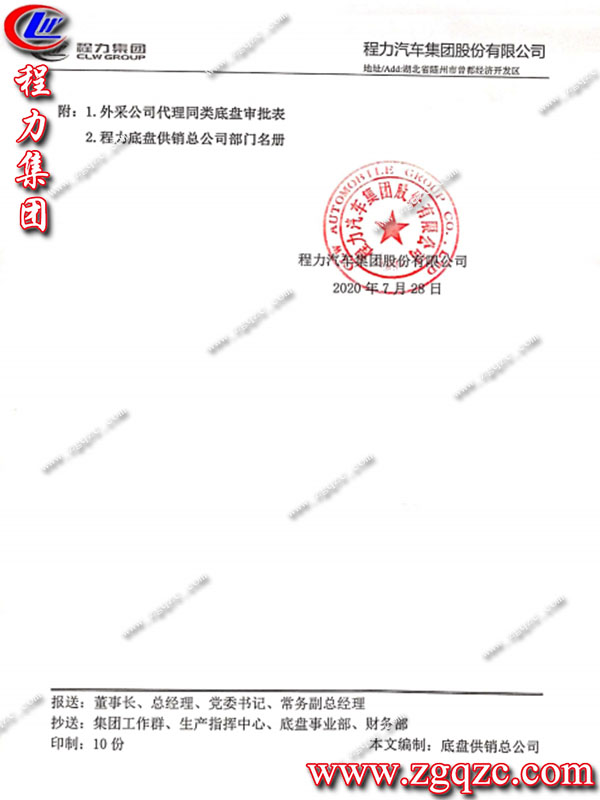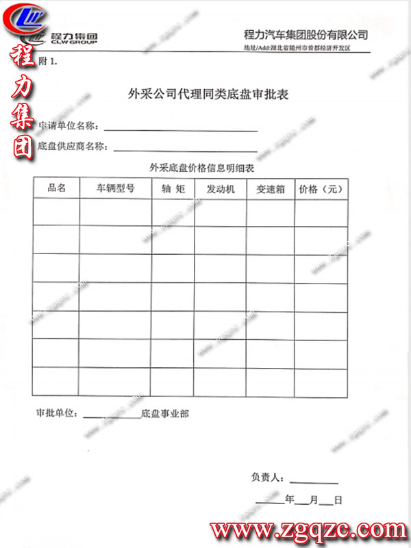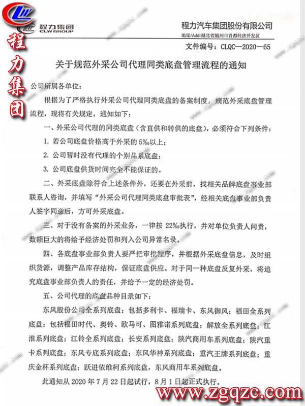 程力集團(tuán)根據(jù)為了嚴(yán)格執(zhí)行外采公司代理同類底盤的備案制度,規(guī)范外采底盤管理流程,現(xiàn)將有關(guān)規(guī)定,通知如下: