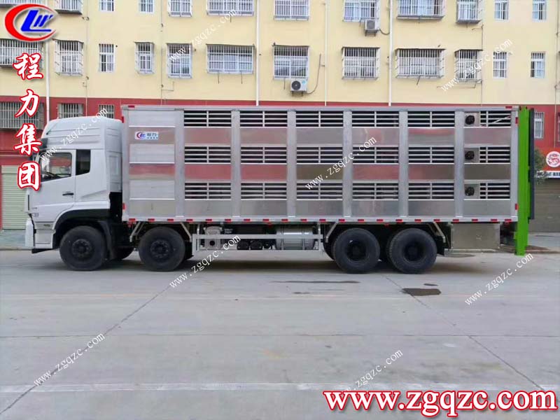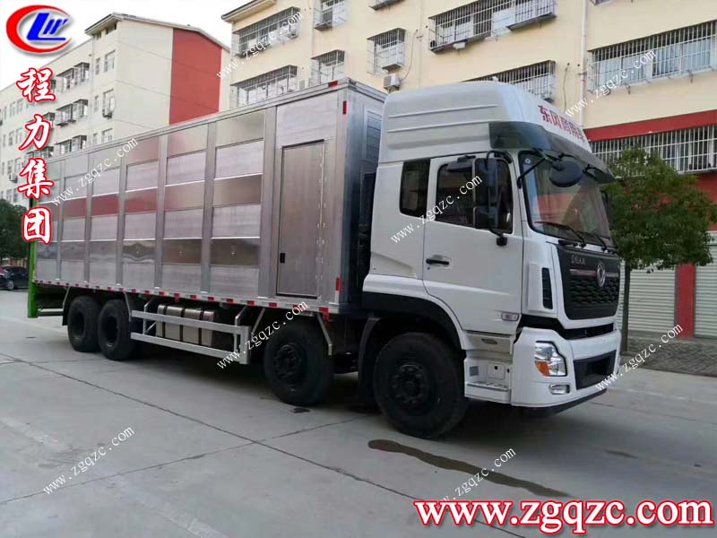 程力集團(tuán)的東風(fēng)天龍鋁合金恒溫運(yùn)豬車(chē)的配置參數(shù):外形長(zhǎng)度:12000x2550x3980,貨箱尺寸:9100x2400x2540,總質(zhì)量為31000kg;由車(chē)載制冷機(jī),暖風(fēng)機(jī),氣體混合輸送倉(cāng),箱體排風(fēng)扇等組成,實(shí)現(xiàn)仔豬生存空間氣體的通和恒溫。