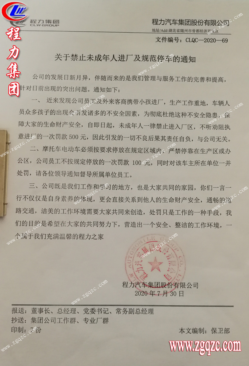 湖北程力集團(tuán)關(guān)于禁止未成年人進(jìn)廠及規(guī)范停車(chē)的通知