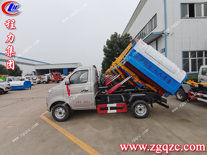 上圖為程力集團(tuán)長(zhǎng)安牌車廂可卸式垃圾車右前方視圖