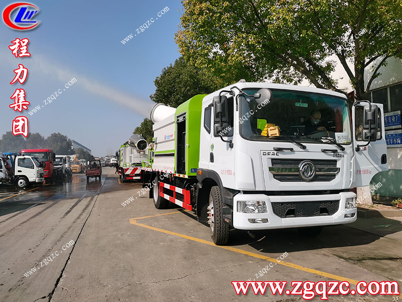 小編原計(jì)劃是去房車的車間參觀學(xué)習(xí),中途被抑塵車的試車給深深吸引了,于是就跑到湖北程力抑塵車間門口看抑塵車試車,正在試車的這臺抑塵車是東風(fēng)D9的抑塵車,采用東風(fēng)公司原裝底盤,軸距4500mm,底盤發(fā)動機(jī)為康明斯210馬力,東風(fēng)6檔箱,國六排放標(biāo)準(zhǔn),ABS,原廠空調(diào)。罐體容積10立方,罐體為方形罐,采用優(yōu)質(zhì)Q235碳鋼,罐體做防腐防銹處理。而且?guī)в袨⑺嚨囊磺泄δ埽褪乔皼_后灑、側(cè)噴和平臺高炮。霧炮的霧化距離可達(dá)80米,還帶有100米無線遙控操作。