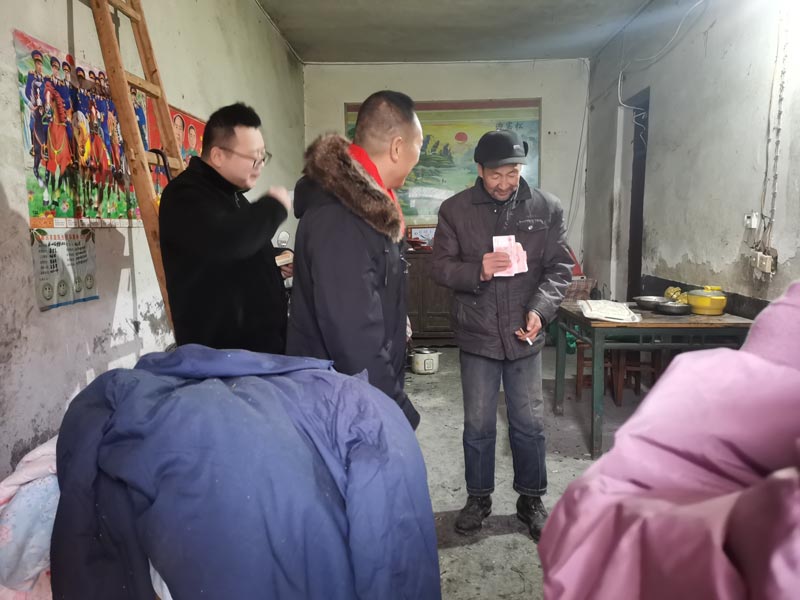 與肖先朝老人家告別后馬主管就帶我們?nèi)ネ讼乱患遥す鈴?qiáng)大爺家住府河鎮(zhèn)鈺山村十二組,是一位普普通通的村民,他的兩個女兒都已經(jīng)出嫁了,但妻子身體不是很好。平時(shí)皮光強(qiáng)大爺農(nóng)閑時(shí)就會打一些臨工,而一次拆房意外事故讓他花光了家里的積蓄,生活也就些貧困。馬主管與他交談詢問了他的身體狀況,也為皮光強(qiáng)大爺家?guī)砹舜竺?、油等慰問品,也遞給皮光強(qiáng)大爺500元的慰問金。