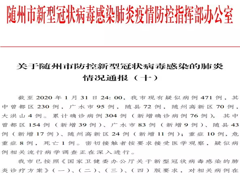 目前疫情截至2020年1月31曰24:00,我市現(xiàn)有疑似病例471例,其中曾都區(qū)230例,廣水市95例,隨縣72例,隨州高新區(qū)70例, 大洪山4例。累計確診病例304例(新增確診病例76例),其中曾都區(qū)154例(新增39例)、廣水市83例(新增9例)、隨縣43 例(新增17例)、隨州高新區(qū)24例(新增11例);重癥10例,危重癥8例,死亡1例。密切接觸者按要求接受醫(yī)學(xué)觀察,疑似病例相關(guān)流行病學(xué)調(diào)查正在深入進(jìn)行。